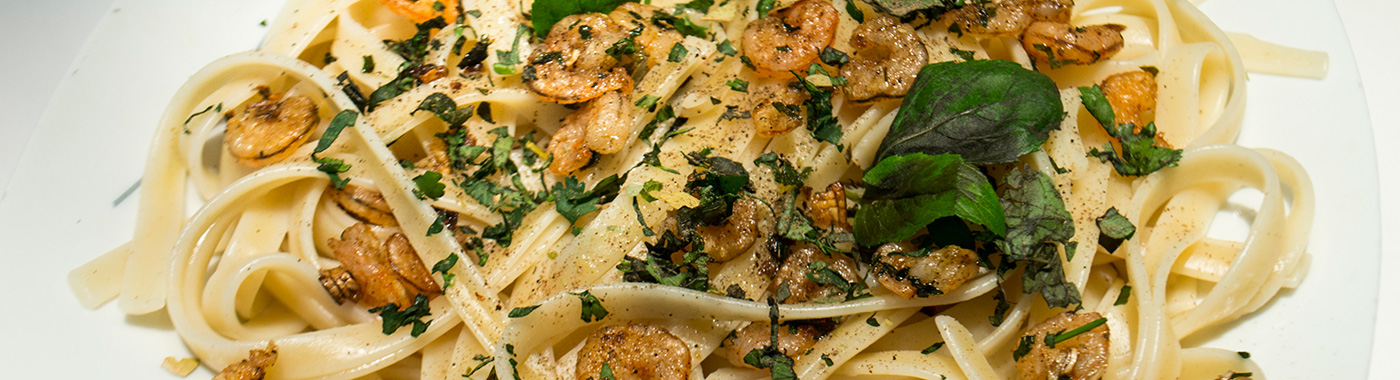 Salteamos todo junto unos instantes, espolvoreamos con el perejil picado y ya tenemos nuestros tallarines con camarones al ajillo. Servir al instante con una rebanada de pan y decorar con perejil.